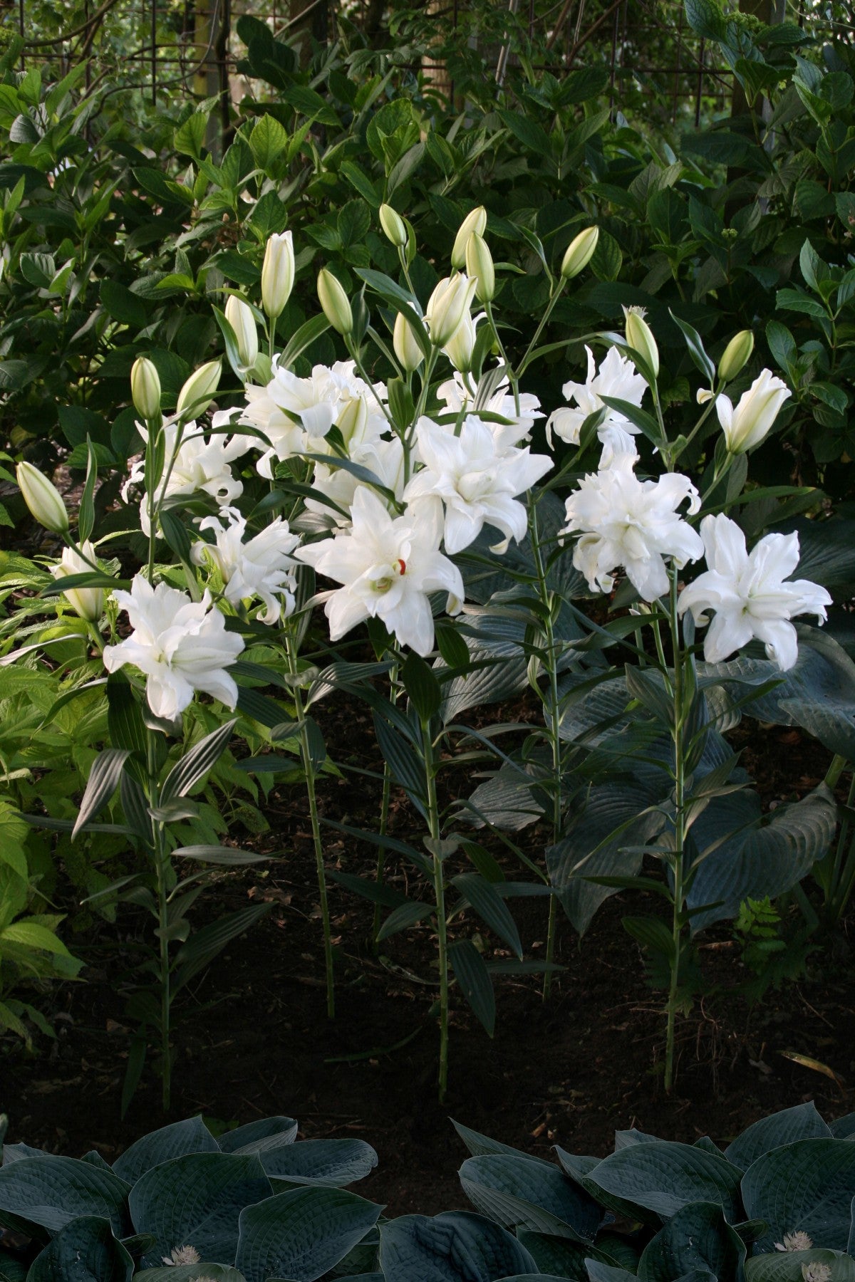 De witte dubbele oriëntaalse lelie ‘Lotus Beauty’ is een schitterende tuin- en snijbloem.