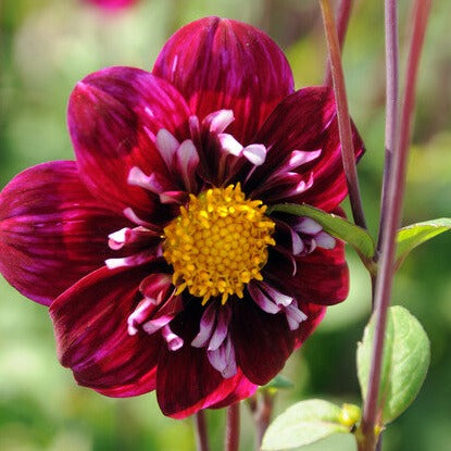 Deep wine red with yellow It is a grateful summer bloomer that will give you pleasure for months. And the bees will be happy too. Collar dahlias stay lower and have an open center, allowing bees and butterflies easy access to the pollen.