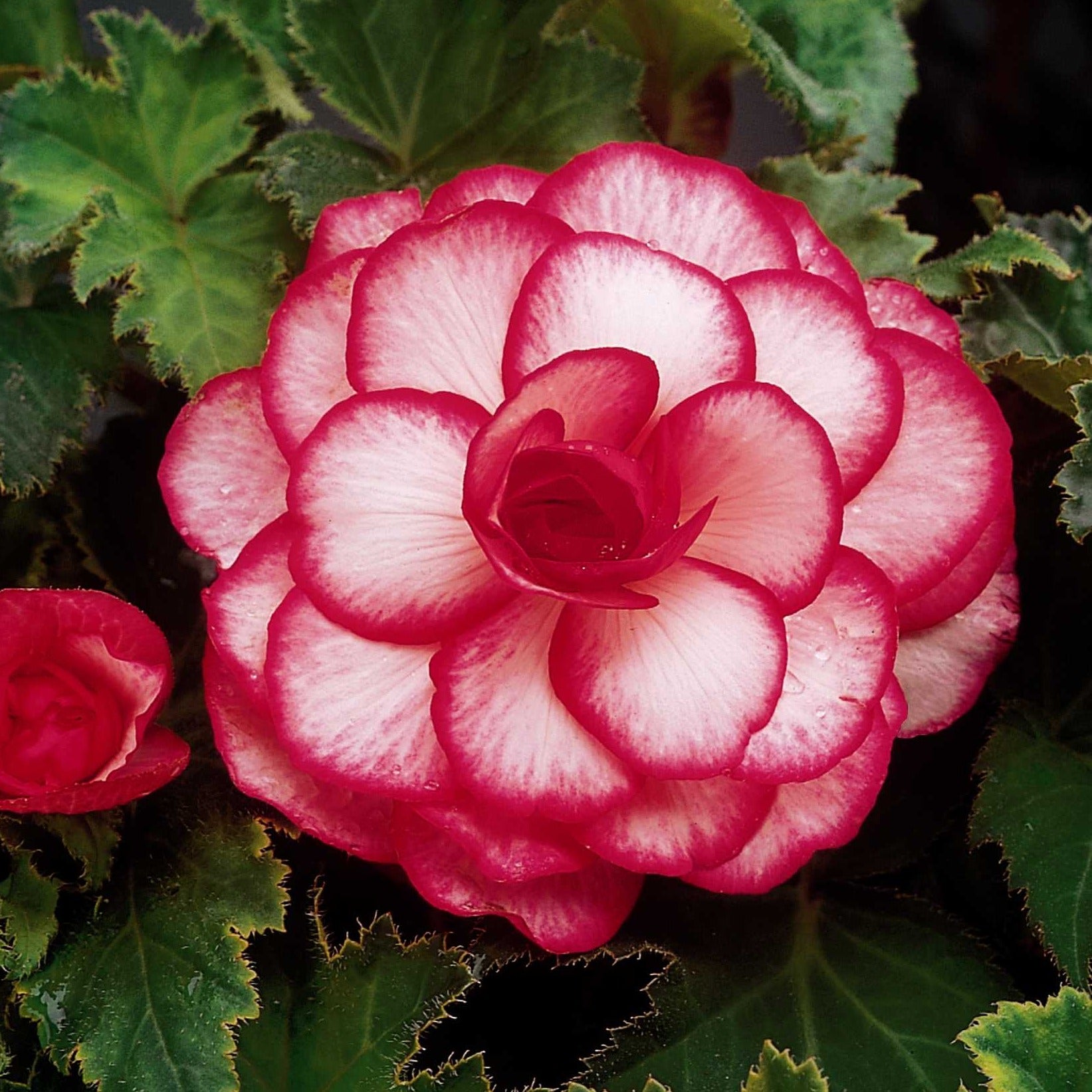 Grande fleur, double fleur et richement fleurie. Bouton de Rose produit de très nombreuses fleurs aux pétales blanc rosé bordés de rose de 10 cm de diamètre. Bégonia au port dressé et aux tiges robustes solides face au vent