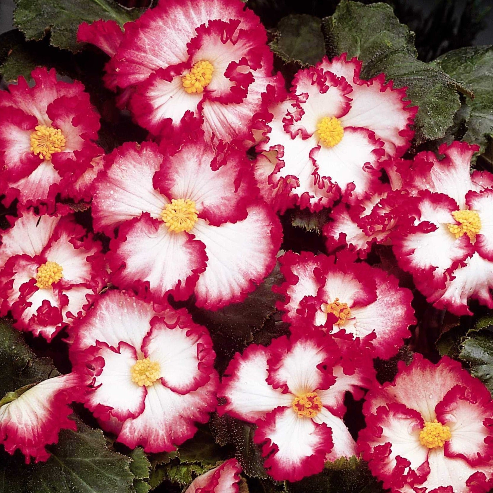 Grandes fleurs simples ondulées très décoratives, découpées, blanches bordé de rouge. Jouez sur l’originalité de la robe bicolore de ces bégonias pour offrir à votre jardin un décor gai et enjoué pendant tout l’été.