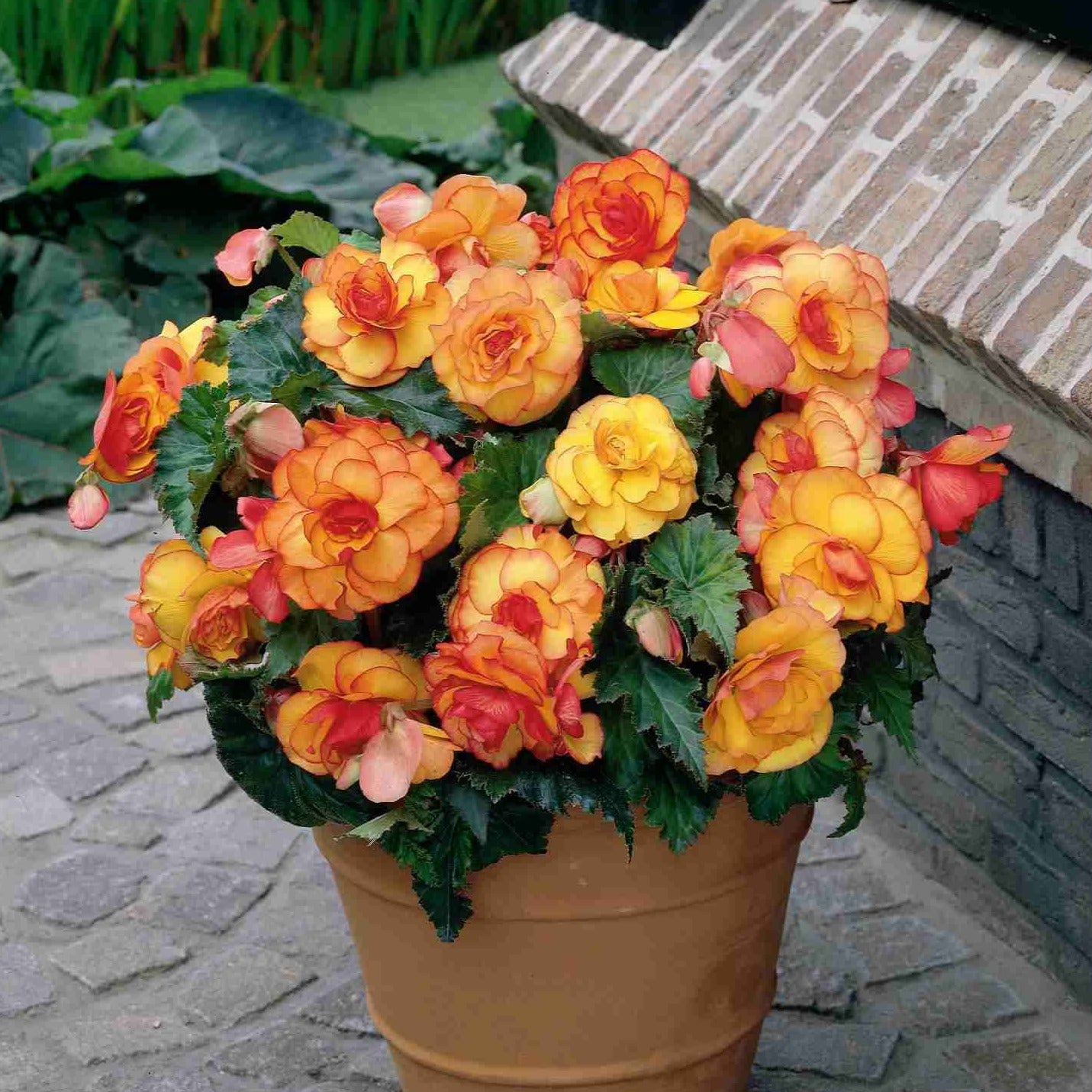 Grandes fleurs doubles orangé bordé de rouge. Pour massifs, bordures ou pots. La plus éblouissante des fleurs de l’été est le Bégonia. La floraison commence courant juillet et se prolonge jusqu’aux gelées !
