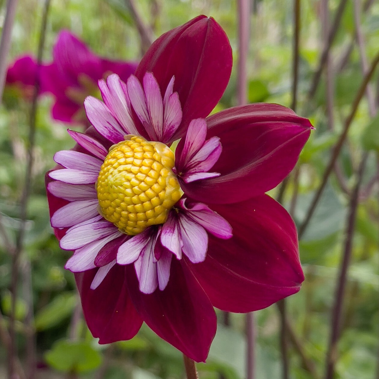 Les fleurs des Dahlias collerette sont composées d'une couronne de pétales larges et plats, entourant une collerette centrale de petits pétales courts et irréguliers qui dévoilent le coeur jaune de la fleur.
